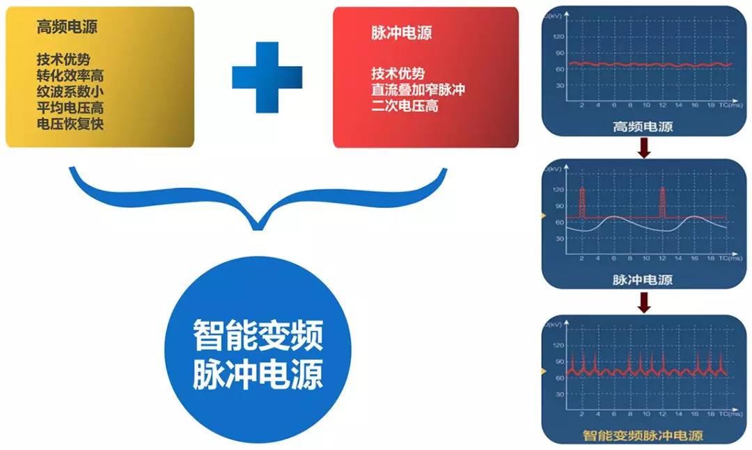 達到超低排放的必要手段,除了本體進行技術改造外,還必須對控制電源進行更換升級,使用直流疊加脈沖技術,是目前可使用的可靠方案。脈沖電源技術主要針對高比電阻粉塵,消除反電暈現象,主要是通過自動調整脈寬、脈幅、脈沖重復頻率,改變電流密度,使粉塵層的比電阻與電流密度和乘積小于粉塵層的擊穿電壓,讓帶負電的粉塵到達陽極后緩慢中和變成中性粉塵,有利于粉塵振打剝離落入灰斗,進而避免粉塵層擊穿出現反電暈,大大提高電除塵除塵效果的技術。