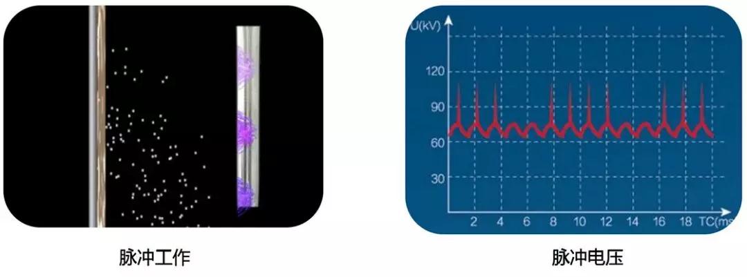 ▲ 峰值電壓高,單位空間內被激發出的電子密度大,轟擊飛灰粒子表面,使粒子的荷電量超過飽和電場荷電的極限,從而使粉塵獲得更快的趨近速度,提高除塵效率。