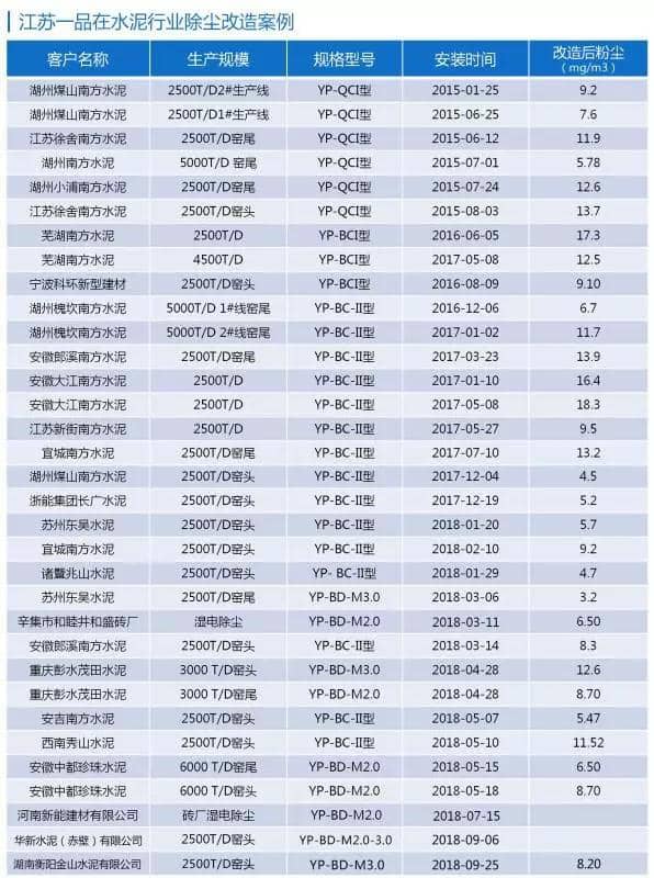 江蘇一品的上述系統改造方案,通過對除塵器本體進行科學合理的技術改造,并將原有的控制電源根據電場順序更換成江蘇一品環保生產的系列“智能變頻脈沖電源”,已對數十條水泥生產線進行了“達標排放”和“超低排放”改造,均達到了滿意的預期效果。