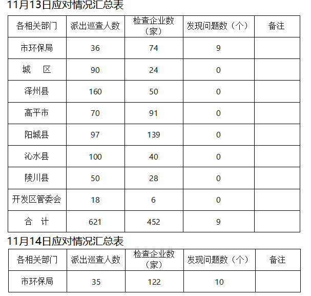 收到預警通知后,為確保所有應對措施能夠落實到位,晉城市環保局緊急安排部署,分13個組,聯合城區、澤州縣、開發區環保部門,奔赴晉城市各重點區域進行巡查。截至14日16時,晉城市、縣兩級環保部門共檢查企業574家,多數企業按照相關預案積極響應并執行預警應對措施,但仍有19家企業未完全落實應對措施。