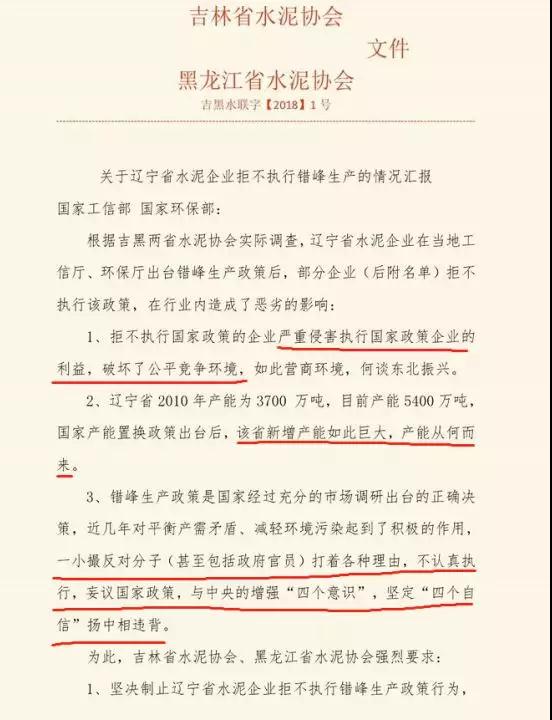 黑吉兩省水泥協會聯合發文中提到遼寧省水泥產能在國家去產能的大背景下,不減反增,從2010年到目前新增加2000萬噸;其次,黑吉兩水泥協會指出,錯峰生產政策是國家經過充分的市場調研出臺的正確決策,近幾年對平衡產需矛盾、減輕環境污染起到了積極作用,一小撮反對分子(甚至包括政府官員)打著各種理由,不認真執行,妄議國家政策。