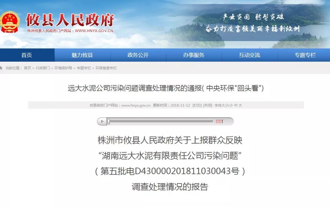 湖南省株洲市攸縣人民政府消息,關于上報群眾反映“湖南遠大水泥有限責任公司污染問題”(第五批電D430000201811030043號),相關調查處理情況如下: