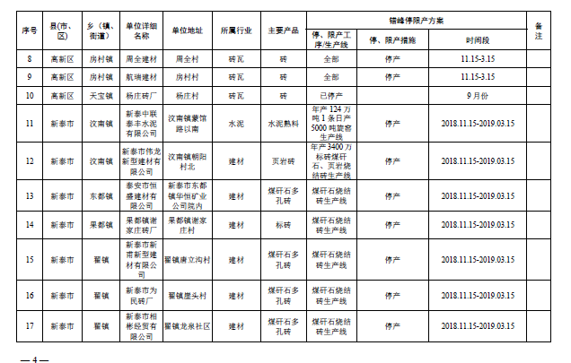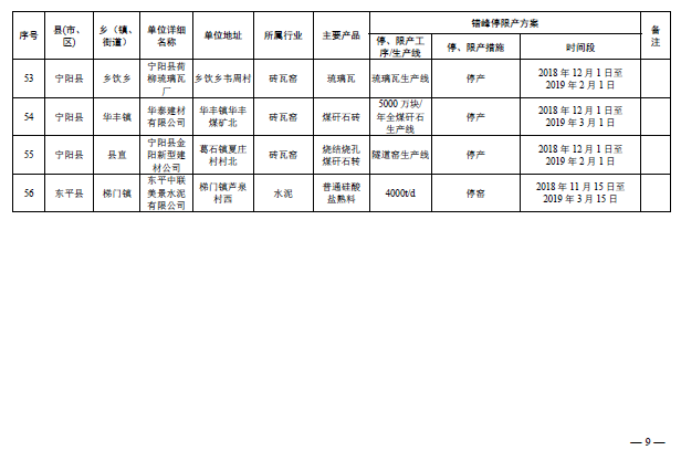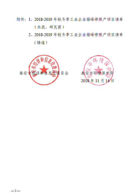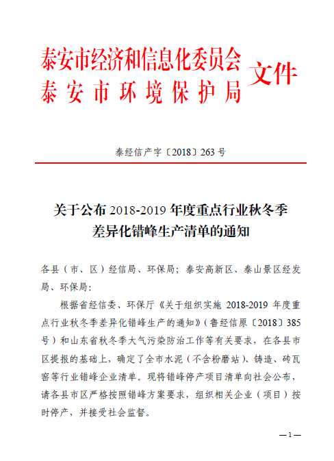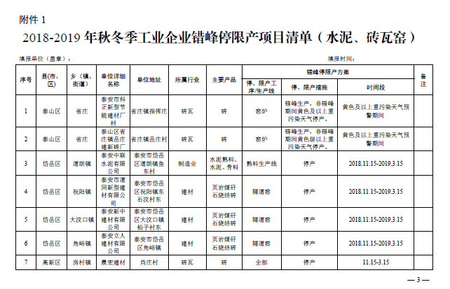 近日,泰安市經濟和信息化委員會和泰安市環境保護局聯合發布《關于公布2018-2019年度重點行業秋冬季差異化錯峰生產清單》的通知,據悉,在各縣市區提報的基礎上,確定了全市水泥(不含粉磨站)、鑄造、磚瓦窯等行業錯峰企業清單。錯峰停產項目清單將向社會公布,要求各縣市區嚴格按照錯峰方案要求,組織相關企業(項目)按時停產,同時接受社會監督。