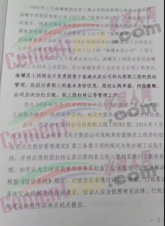“您要求海螺集團工會公布海螺員工持股會自成立至2013年管理的荻港水泥公司內部職工股資料沒有事實和法律依據,公司決定不予提供。”