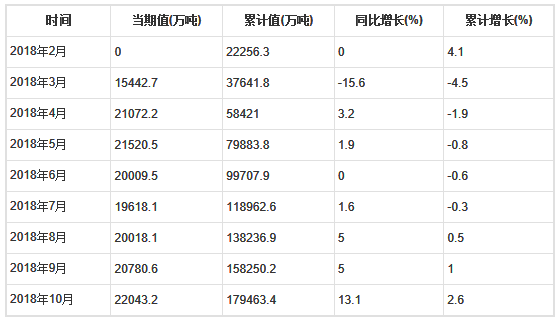 2018年10月全國水泥產量為22043.2萬噸,累計值為179463.4萬噸,同比增長13.1%,累計增長2.6%。