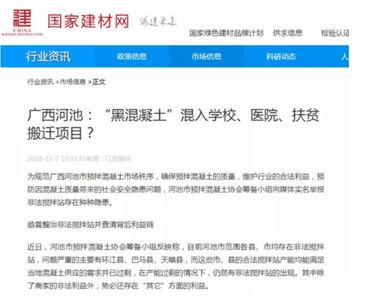 2018年11月6日,一篇題為《廣西河池:“黑混凝土”混入學校、醫院、扶貧搬遷項目?》的報道,揭開了河池市“黑混凝土”的面紗。該“曝光”,竟然是來自河池市預拌混凝土協會籌備小組(下稱混凝土協會)的實名舉報!