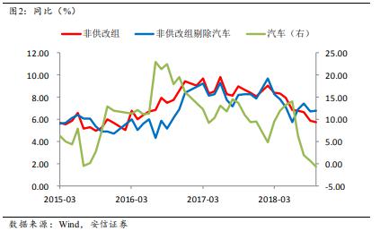 作為與真實經濟更為相關的非供改組的走勢值得進一步深入探討。汽車行業占比較大,而且今年以來波動較大,可能對整體數據有干擾。如果我們把非供改組剔除汽車以后,實際上非供改組的生產走勢自7月份以來保持平穩。