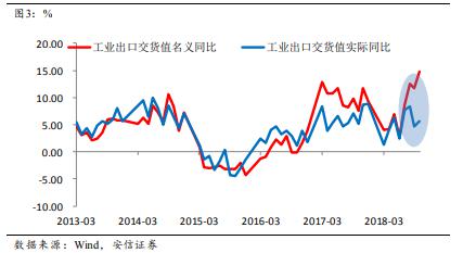 這與市場的感官認知有一定的差異,也與之前一路下降的走勢不一致。我們認為,7-10月出口出現了明顯的反彈,支撐了7-10月的工業生產。由于人民幣貶值,出口名義值反彈明顯;但即使從實際值看,7-10月的工業出口實際增速為6.6%,比3-6月的3.5%多增了3%;如果按照出口占工業生產的30%粗略估計,這四個月出口的回升拉升了工業增加值增速將近一個百分點。