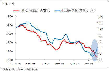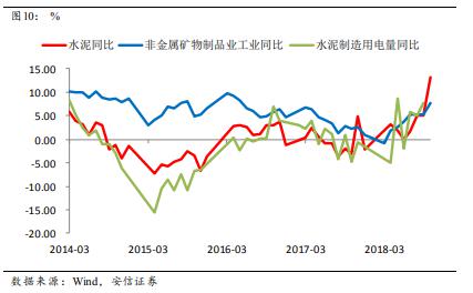 但隨后我們看到,鋼鐵價格和生產都在明顯走強,這意味著需求是較強的;而另一方面基建投資在明顯走弱,這可能意味著房地產投資可能要好于預期。一個可能的解釋是,房地產企業2018年資金緊張,但又想加大土地購置,因此房企拿地后,趕緊開工至總投資額的25%之后馬上辦理預售證后開盤銷售,盡快回款,但之后緩慢施工。一般來說,房屋總投資25%的進程都已經建至地面以上,打基礎的部分大概要消耗鋼筋水泥的一半左右,這使得水泥包括鋼鐵的消耗量大增。