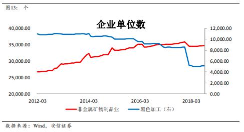 第一個解釋還需要更多的證據。關于第二個解釋,我們知道鋼鐵煤炭的去產能盛行于2016-2017,但水泥行業的動作要晚,去年才頒布了《水泥行業去產能行動計劃(2018~2020)》。特別的,從企業單位數這個指標來看,水泥行業直到2017年的單位數還在增長,而鋼鐵、有色、化工等行業的企業單位數從2015年以來都是在下降的。因此,水泥行業的供給側改革可能導致幸存者偏差的問題,使得統計數據高估。