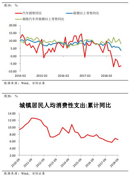 今年以來社會消費品零售總額和限額以上零售同比下滑明顯,很大程度上是受到汽車銷售大幅下滑的影響。如果剔除汽車部分,限額以上零售的其他部分同比增速甚至略有上行。但10月汽車銷售跌幅收窄,同時限額以上零售增速明顯放緩,使得去除汽車的其他消費出現了下滑。但這個下滑是否持續還需要進一步觀察。另外,從城鎮居民人均消費支出這個指標上看,暫時沒有明顯看到消費有大幅下滑的跡象。