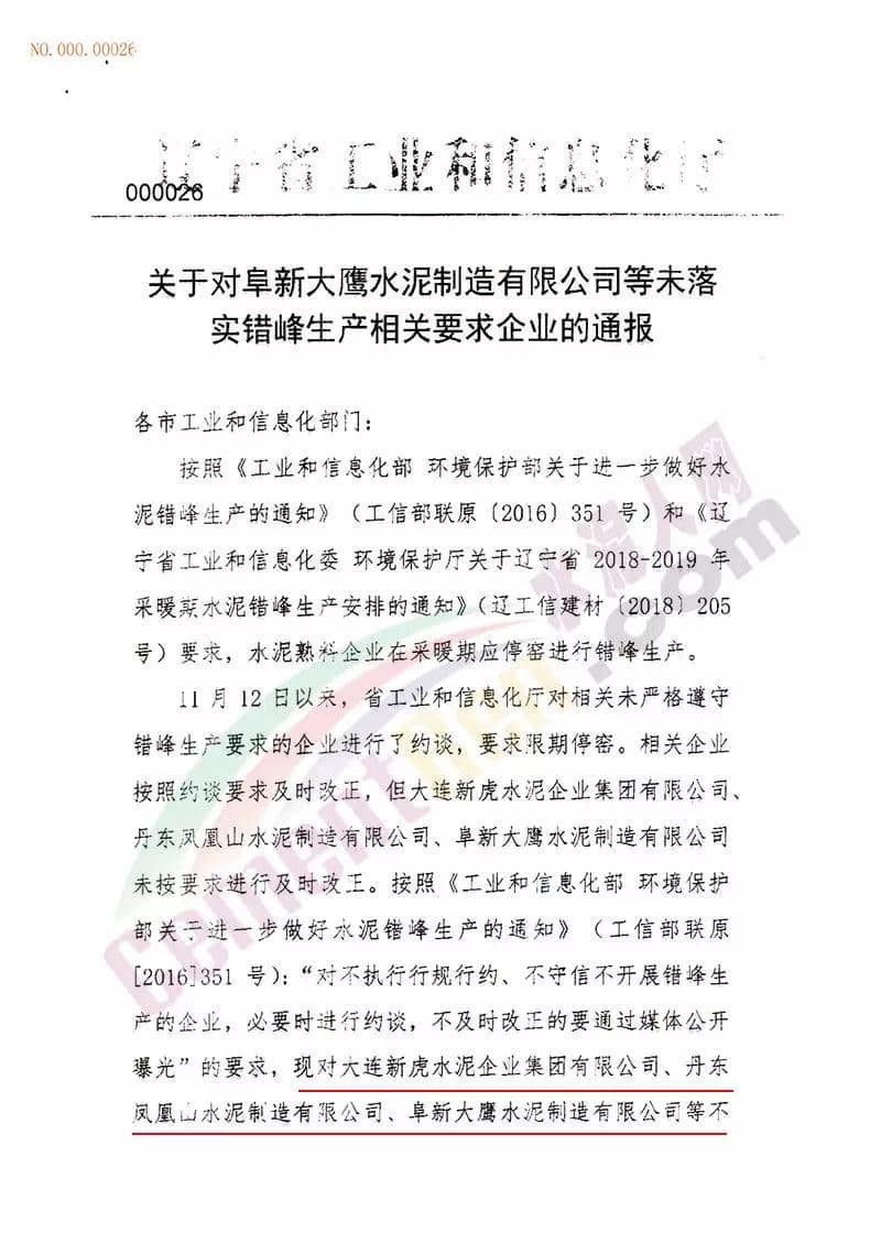 日前,遼寧省工業和信息化廳發布《關于對阜新大鷹水泥制造有限公司等未落實錯峰生產相關要求企業的通報》,通報文件稱,按照《工業和信息化部 環境部關于進一步做好水泥錯峰生產的通知》(工信部聯原(2016)351號)和《遼寧省工業和信息化委 環境保護廳關于遼寧省2018-2019年采暖期水泥錯峰生產安排的通知》(遼工信建材(2018)205號)要求,水泥熟料在采暖期應停窯進行錯峰生產。