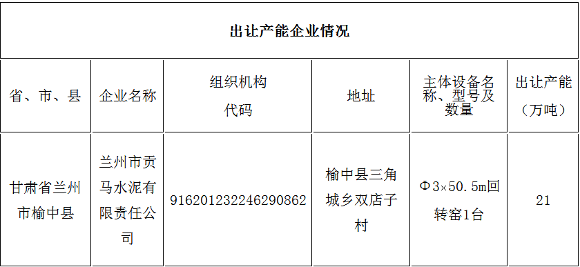 按照《國務院關于化解產能嚴重過剩矛盾的指導意見》(國發〔2013〕41號)、《工業和信息化部關于印發鋼鐵水泥玻璃行業產能置換實施辦法的通知》(工信部產業〔2017〕337號)和《甘肅省工業和信息化委員會關于做好鋼鐵水泥等行業產能置換工作的通知》(甘工信發〔2018〕241號)要求,現將蘭州市貢馬水泥有限責任公司水泥熟料產能出讓情況予以公示,歡迎社會公眾進行監督。
