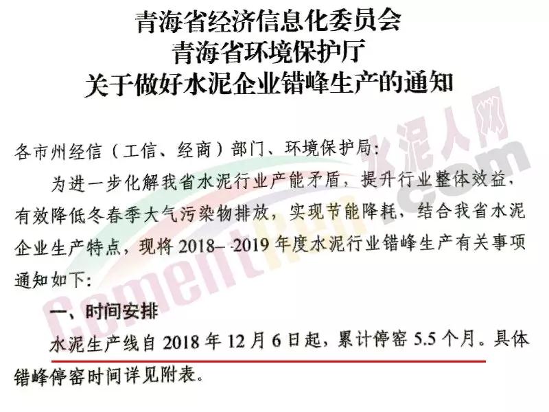 錯峰生產的通知》要求,全省12戶水泥企業20臺水泥窯自2018年12月6日起,累計停窯5.5個月。全文如下: