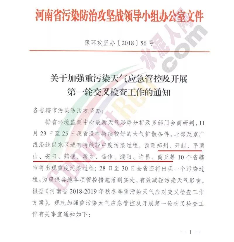 水泥人網最新消息,昨日(22日)河南省污染防治攻堅戰領導小組辦公室發布《關于加強重污染天氣應急管控及開展第一輪交叉檢查工作的通知》(豫環攻堅辦【2018】56號文件。文件稱,根據河南省環境監測中心最新天氣形勢分析及多部門會商研判,11月23日至25日河南省沒有持續較好的大氣擴散條件,北部及京廣線沿線以東區域有持續輕中度污染過程,預測鄭州、開封、平頂山、安陽、鶴壁、新鄉、焦作、濮陽、許昌、商丘等10個省轄市將出現重度污染過程;28日至30日全省還將出現一個污染過程。