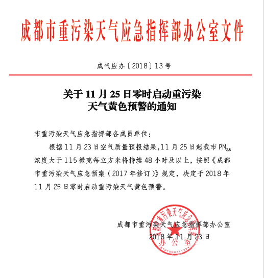 按照《關于空氣重污染期間實施臨時交通管理措施的通告》,成都市公安局交通管理局于11月25日(星期日)零時起,啟動重污染天氣黃色預警臨時交通管理措施,具體如下: