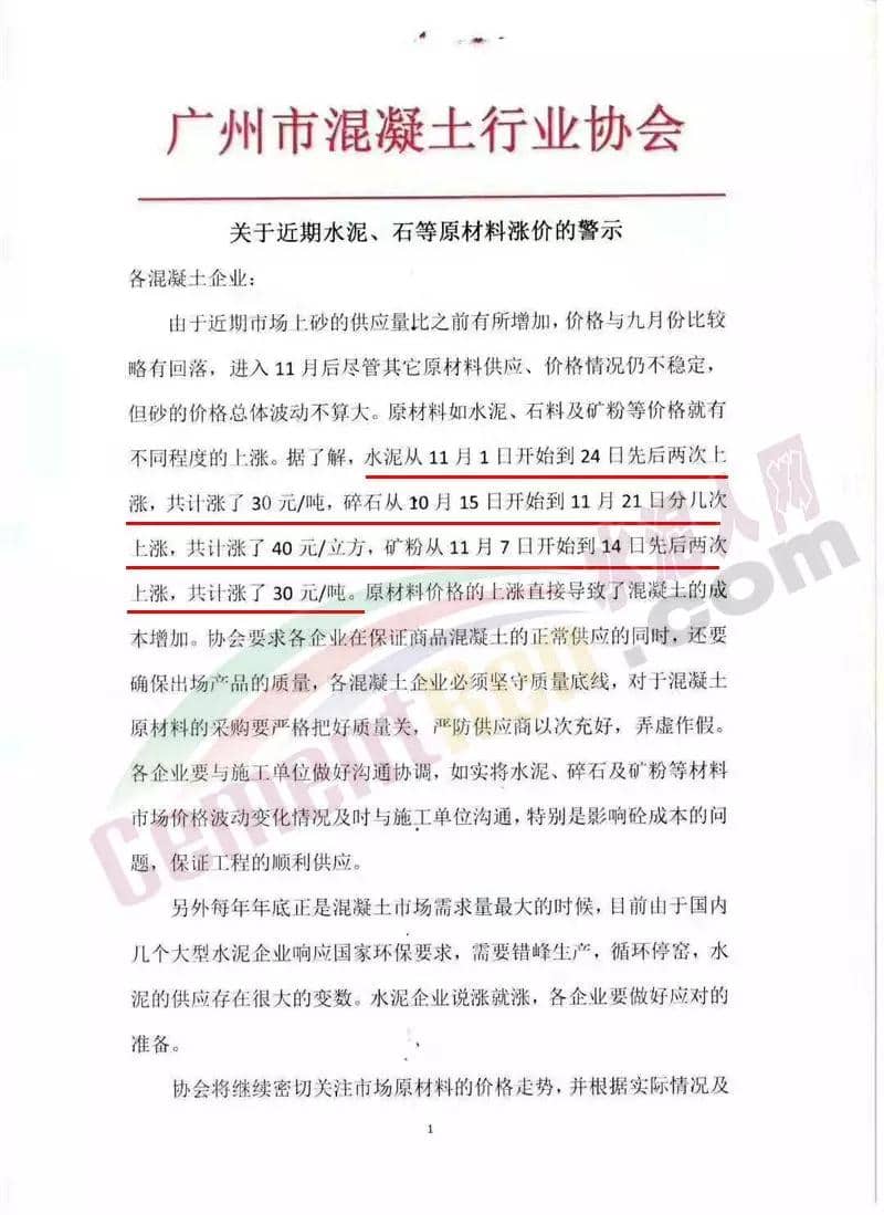 同一天,廣東省佛山市順德區混凝土學會發布了《關于當前混凝土市場價格調整的建議函》。建議函稱將近年底,隨著各項施工項目追趕進度,建筑市場的需要依然旺盛,市場上涉及混凝土生產的主要原材料價格亦紛紛上調,且供不應求,同時疊加人力成本的增加,使混凝土企業的成本壓力增大。