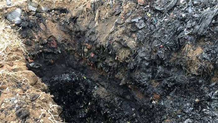 督察發現,該非法填埋場長400余米,寬約60米,深度在10米以上,填埋量達20萬立方米左右,不僅填埋了大量生活垃圾,還混雜填埋醫療廢物和工業危險廢物。2018年11月15日,督察組隨機選取7個點位進行挖掘,發現填埋物多呈黑褐色,并伴有強烈刺鼻氣味。經專業機構取樣鑒別,因生活垃圾與危險廢物混雜填埋,填埋的廢物均具有危險廢物特性。