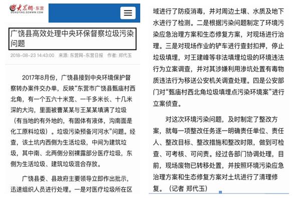 廣饒縣于2018年6月15日對外公開了該交辦問題的整改完成情況,并將驗收銷號情況上報東營市。東營市僅做匯總,未核實情況,整個驗收銷號工作流于形式。2018年8月23日,《東營日報》還以“廣饒縣高效處理中央環保督察垃圾污染問題”為題,對其整改過程進行正面宣傳報道。