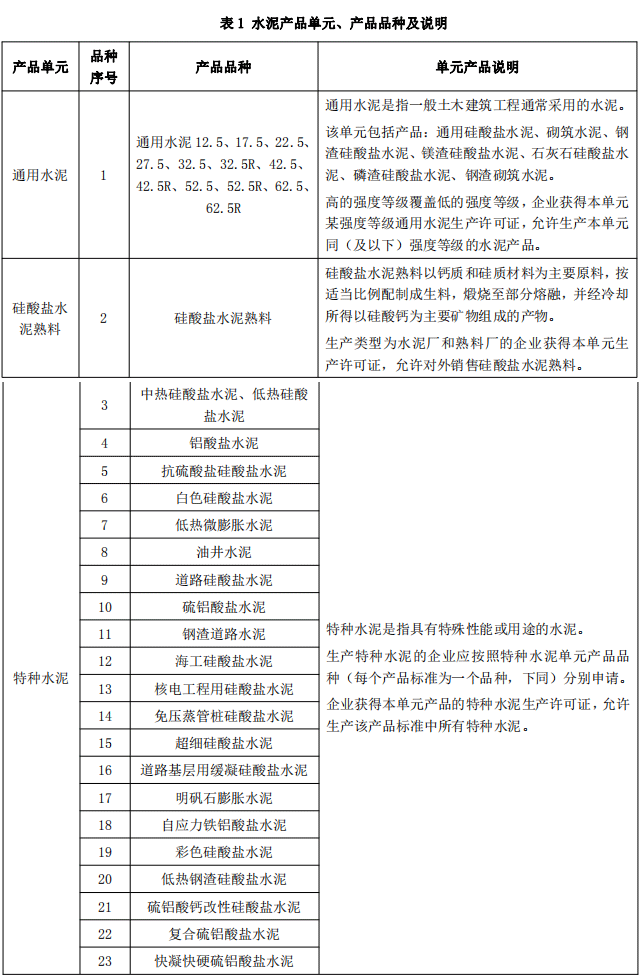 本細則規定的水泥產品劃分為3個產品單元,23個產品品種。水泥產品單元劃分見表1。