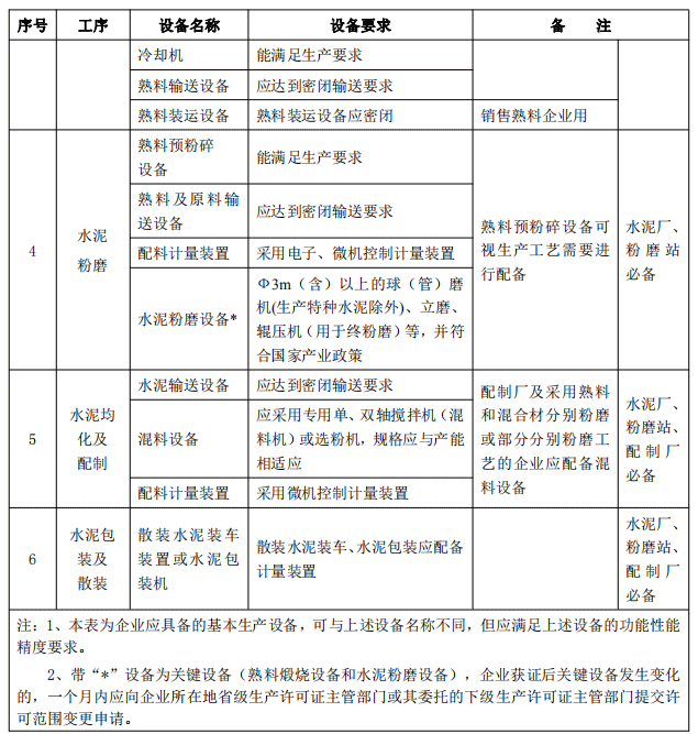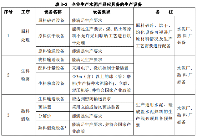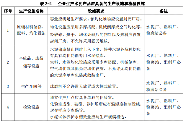 第七條 企業生產水泥產品應具備本條款規定的基本生產條件,內容包括:生產設施和檢驗設施、生產設備和檢驗設備,具體要求見表3-2至表3-4。