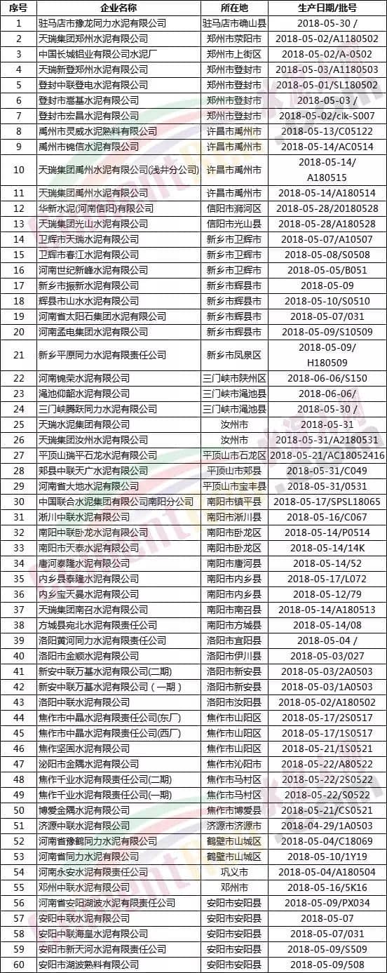 本次抽查共抽取了鄭州、開封、洛陽、漯河、平頂山、三門峽、商丘、安陽、鶴壁、新鄉、焦作、駐馬店、周口、濮陽、許昌、南陽、信陽、濟源等18個省轄市和鞏義、固始、鄧州、長垣、鹿邑、汝州、新蔡、永城等8個直管縣(市)168家企業生產的170批次水泥產品。