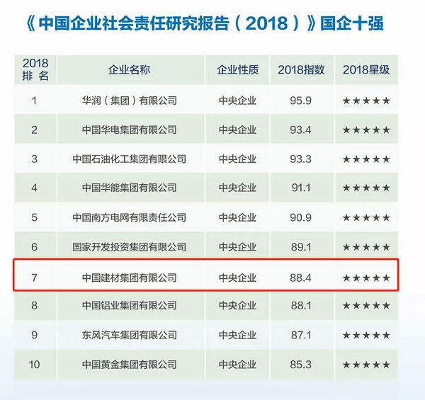 11月23日,由中國社會責任百人論壇、社會科學文獻出版社主辦的《企業社會責任藍皮書(2018)》發布會在京召開,中國社科院發布第10本《企業社會責任藍皮書》。中國建材集團以發展指數88.4位列中國企業300強第9位,國有企業100強第7位,連續6年位列“卓越者”行列。