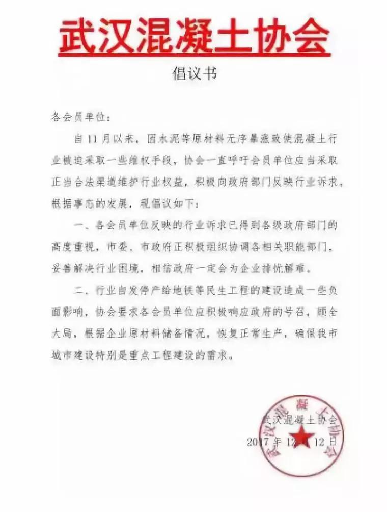 同期湖北武漢混凝土協會發出倡議書稱,因水泥等原材料無序暴漲致使混凝土行業采取一些維權手段,武漢混凝土協會一直呼吁會員單位應當采取正當合法渠道維護行業權益,積極向政府部門反映行業訴求。