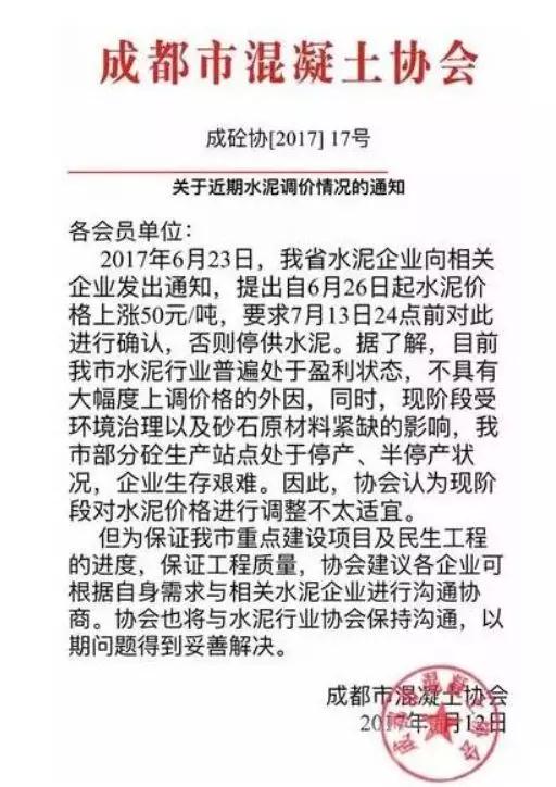 信件指出,“水泥企業無序漲價,引發市場混亂”,“且告知混凝土企業,如不在漲價函上簽字確認,將予以停止水泥供應,此舉還從側面引發了預拌混凝土其他原材料(如粉煤灰、礦粉等)的漲價趨勢,對本來已經岌岌可危的混凝土企業造成致命一擊。”