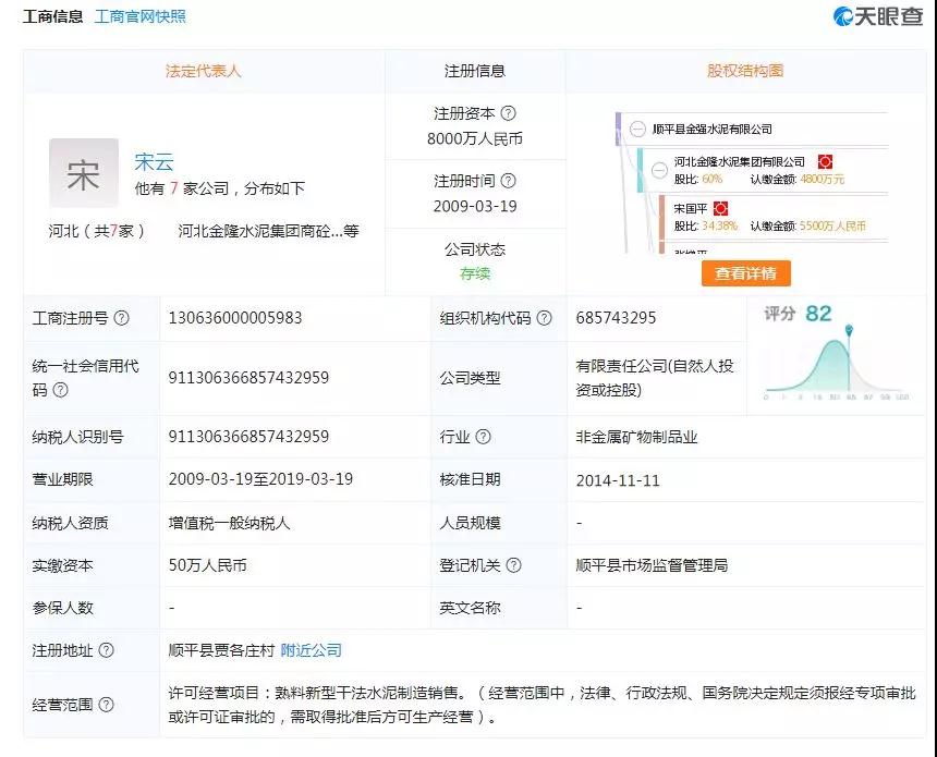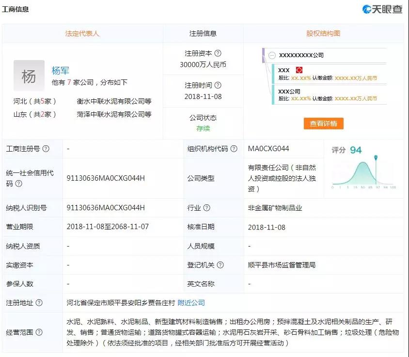 據查詢,保定中聯水泥于2018年11月8日登記注冊。法定代表人楊軍。注冊地址河北保定市順平縣安陽鄉賈各莊村。經營范圍為水泥、水泥熟料、水泥制品、新型建筑材料制造銷售;出租辦公用房;預拌混凝土及水泥相關制品的生產、研發、銷售;普通貨物運輸;道路貨物罐式容器運輸;水泥用石灰巖開采、砂石骨料加工銷售;垃圾處理等。