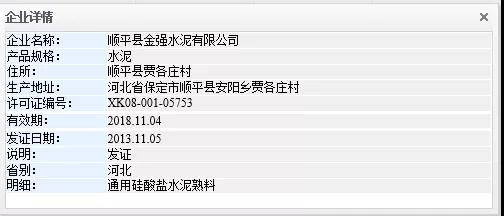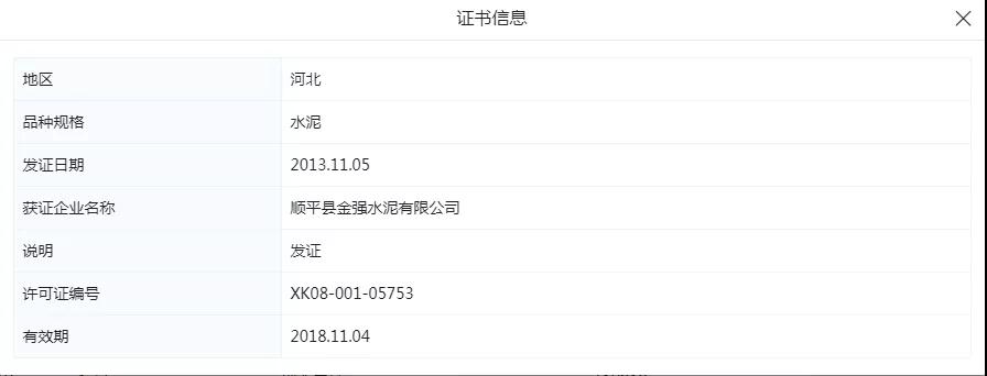 質檢部局生產許可證辦公室相關數據顯示,順平縣金強水泥在2013年11月5日取得生產許可證,有效期至上月4日止。其產品明細為通用硅酸鹽水泥熟料。