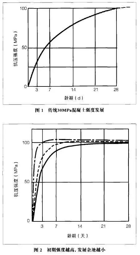 圖1是傳統(tǒng)的混凝土強(qiáng)度正常發(fā)展規(guī)律:相對(duì)于28天的100%,3天約30%;7天約60%。