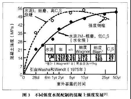 美國(guó)的Withy在威斯康辛大學(xué)從1910年開(kāi)始了50年水泥凈漿、砂漿和混凝土的實(shí)驗(yàn)計(jì)劃,澆筑了室內(nèi)和室外混凝土。分別于1910年、1923年和1937年3個(gè)不同時(shí)間成型了5000多個(gè)試件。Washa和Wendt于1975年發(fā)表了這些試件觀測(cè)50年的結(jié)果。結(jié)果是:1923年用Blaine細(xì)度為5775px2/kg的水泥配制的混凝土28天強(qiáng)度為21MPa,25年強(qiáng)度達(dá)到52MPa;1937年用當(dāng)時(shí)的快硬水泥配制的混凝土28天強(qiáng)度為35MPa,5年達(dá)到53MPa,10年后強(qiáng)度開(kāi)始倒縮,25年強(qiáng)度就倒縮至45MPa,比水化慢的混凝土25年強(qiáng)度還低。當(dāng)時(shí)的快硬水泥與當(dāng)今美國(guó)的I型水泥和II型水泥礦物組成與細(xì)度相當(dāng)(C3S為57%,勃氏比表面積為380㎡/kg,我國(guó)常用水泥也如此)見(jiàn)圖3。