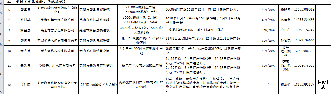 蕪湖 市2018~2019年重點行業冬季錯峰生產企業(生產線)清單