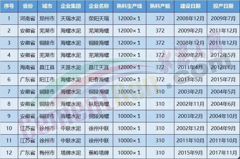行業內有種說法,說萬噸線的各項指標都不如5000噸的,所以很多企業都不再新建萬噸線了。從天瑞水泥2008年新建日產12000噸生產線開始,國內新建了多條日產12000噸的生產線。據不完全統計目前國內日產12000噸的生產線共有7條,詳情如下。