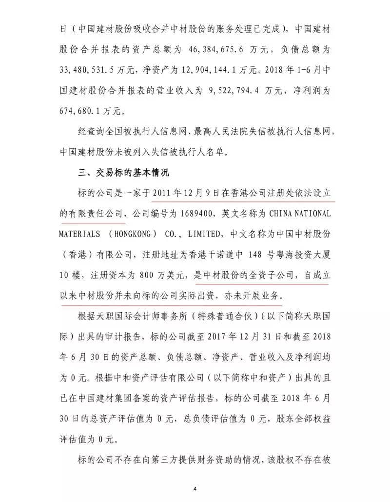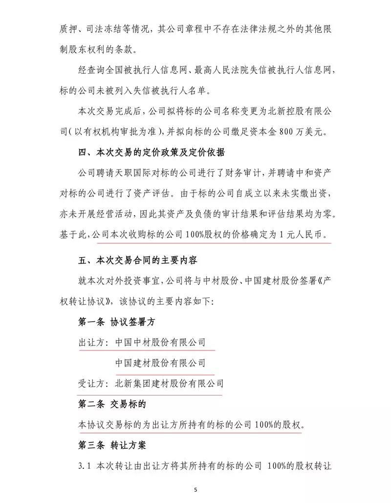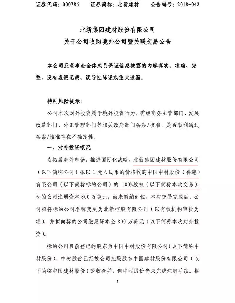 公告顯示,北新建材擬以1元人民幣的價格收購中國中材股份(香港)有限公司(以下簡稱標的公司)100%股權,交易完成后,標的公司將成為公司全資子公司。