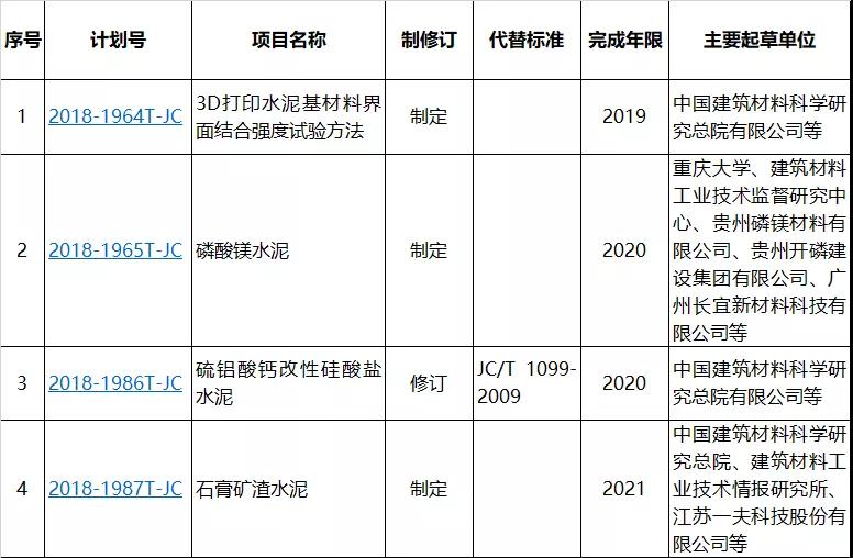 備注:上述項目主管部門均屬工信部原材料工業司。技術委員會或技術歸口單位均為全國水泥標準化技術委員會。標準性質均為推薦。
