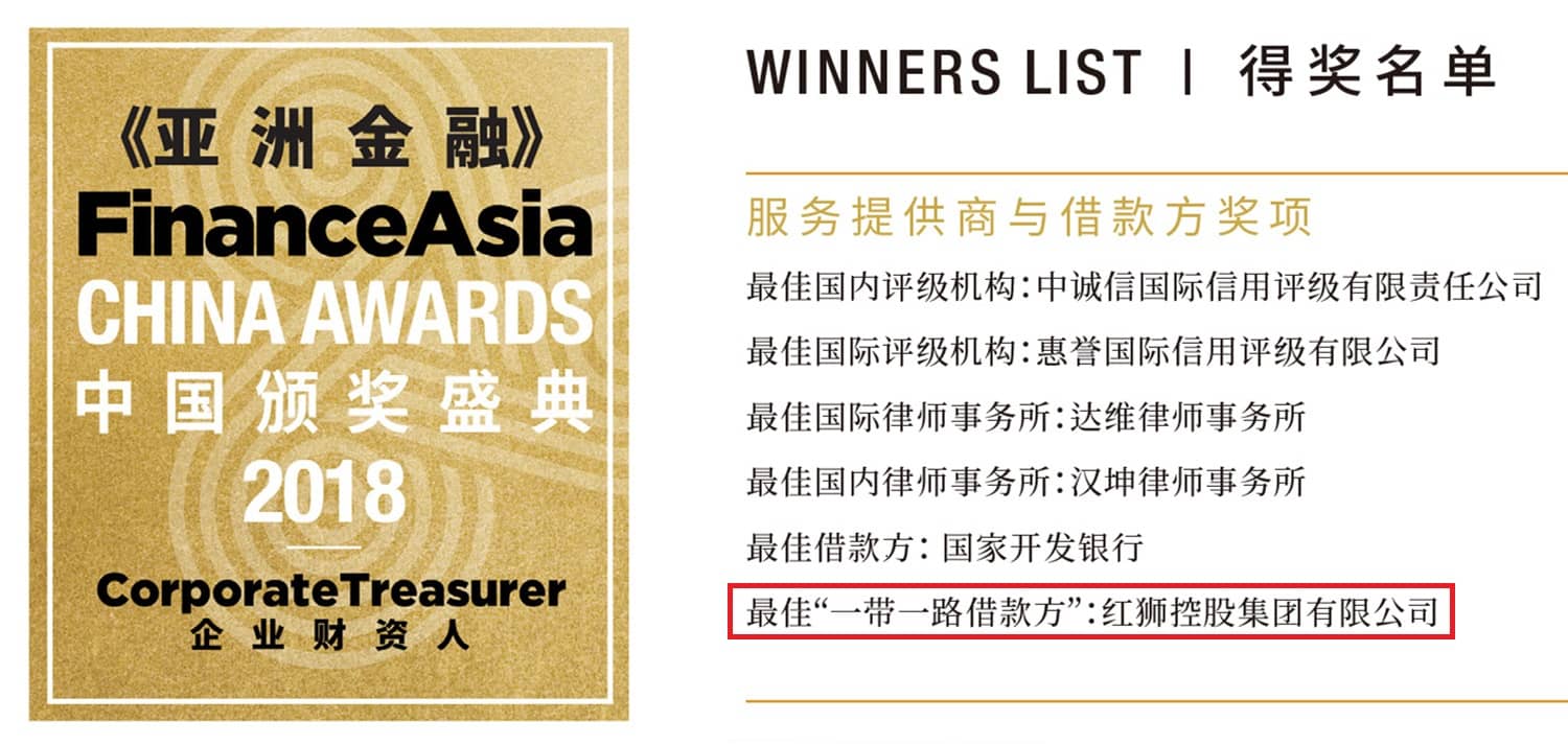紅獅集團發行的2018年“一帶一路”公司債券,榮獲“最佳一帶一路借款方”獎(Best Belt & Road Borrower),與中國國際金融股份、國家開發銀行、中國銀行、高盛集團、匯豐銀行、中誠信評級、國泰君安證券、中信證券等金融機構、銀行、投資銀行及中介機構等一起分享了各項大獎。