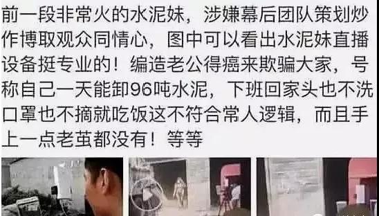 直播相信大家每個人都看過,也有很多的網紅都是靠著直播平臺來賺錢的。同時直播平臺也火了一大批人,我們今天說的就是這樣一個團隊,靠著直播賣慘來博取觀眾的眼球,從而攫取流量來獲得利益。相信大家都知道水泥妹這個人,他們這個團隊就是靠拍攝一個瘦弱的女子在工地上抬水泥來養活家庭,從而博取關注。