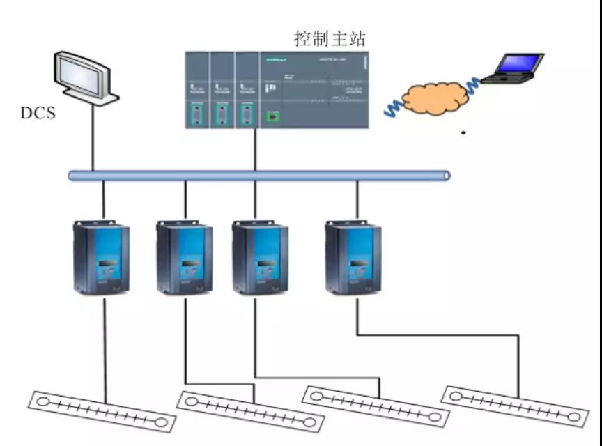 該智能變頻控制系統(tǒng)是以一臺(tái)高性能工業(yè)控制器和多臺(tái)變頻器為核心的控制平臺(tái),硬件配置包括:控制系統(tǒng)、可編程變頻調(diào)速控制系統(tǒng)、監(jiān)控系統(tǒng)(DCS,本地控制人機(jī)界面),如圖2所示。系統(tǒng)通過對拉鏈機(jī)的電壓、頻率、功率、轉(zhuǎn)速等多個(gè)參數(shù)的實(shí)時(shí)監(jiān)控,分析與計(jì)算,按照已設(shè)定好的程序及時(shí)調(diào)整其運(yùn)行模式,從而保障輸送設(shè)備在一個(gè)安全并節(jié)能的運(yùn)行速度運(yùn)行。