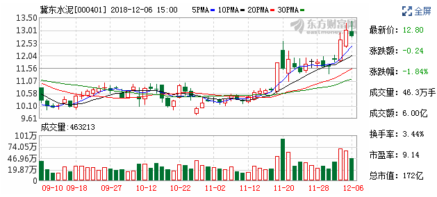 12月6日,冀東水泥A股開盤12.99元,全日下跌1.84%,股價收報12.80元。自12月4日以來,冀東水泥股價有效突破年線(250日均價),收盤價連續三日收于年線之上,3日乖離率為7.83%。