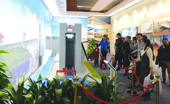 圖為觀眾在三峽升船機模型旁駐足觀看
