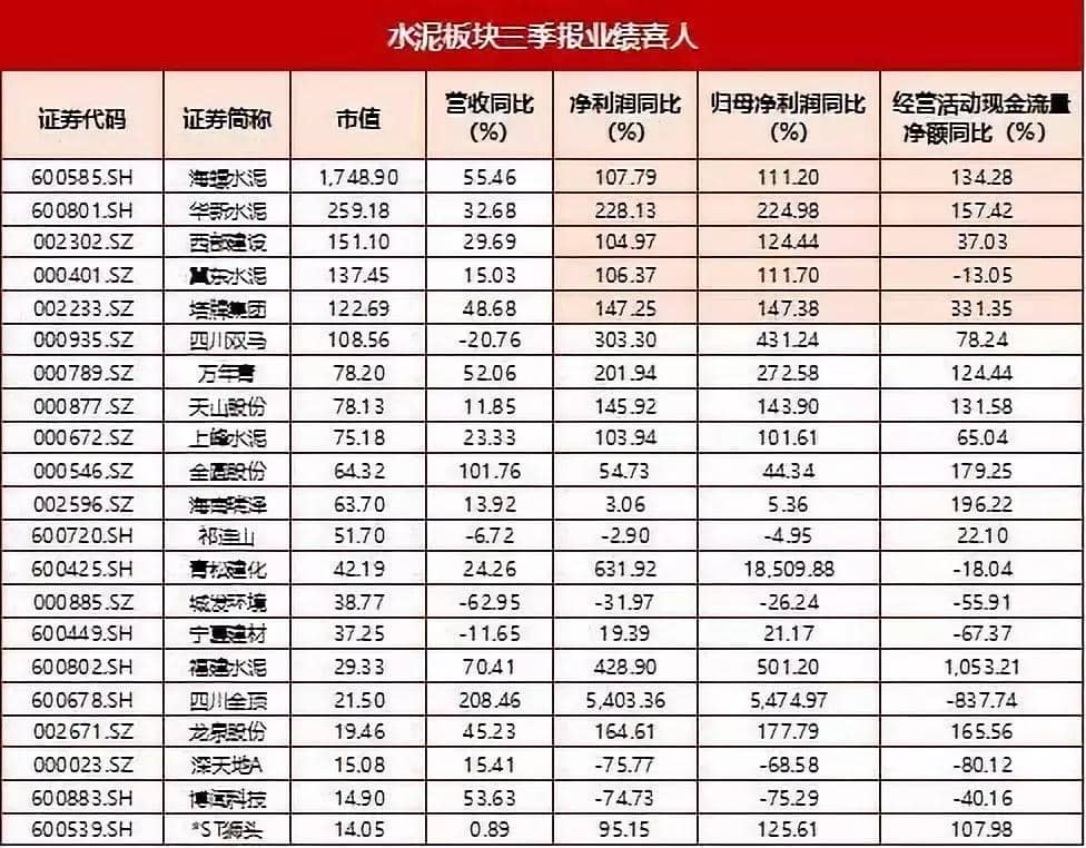 數據顯示,今年前三季度,水泥板塊共實現營業收入1719.89億元,同比增長33.45%;實現凈利潤329.28億元,同比增長115.61%。21家水泥行業上市公司中,17家今年前三季度凈利潤同比實現增長,14家同比增長超過100%。以水泥市值的前五家公司來看,海螺水泥、華新水泥、西部建設、冀東水泥、塔牌集團的凈利潤同比增速在三季度均超過100%。