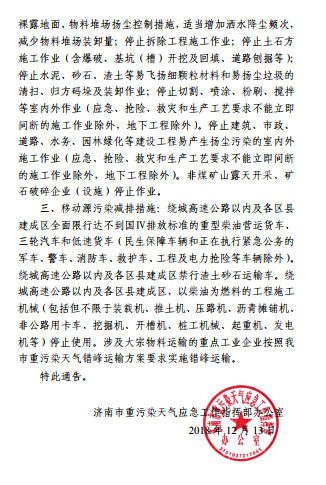 近日,濟南市發(fā)布重污染天氣應(yīng)急工作指揮部辦公室文件 濟南重污染天氣應(yīng)急辦{2018}31號,關(guān)于發(fā)布重污染天氣橙色預(yù)警并啟動Ⅱ級應(yīng)急響應(yīng)的通告。根據(jù)中國環(huán)境監(jiān)測總站與京津冀及周邊地區(qū)省級環(huán)境監(jiān)測中心會商結(jié)果,受不利氣象條件影響,預(yù)計12月14日至16日期間,京津冀及周邊地區(qū)將出現(xiàn)一次區(qū)域性重污染天氣過程。其中我省大部分城市空氣質(zhì)量可能出現(xiàn)連續(xù)出現(xiàn)3天以上重度污染天氣。為有效應(yīng)對重污染天氣,山東省重污染天氣應(yīng)急小組辦公室下發(fā)《關(guān)于切實做好12月14日至12月16日重污染天氣過程應(yīng)對工作的函》