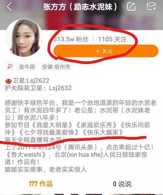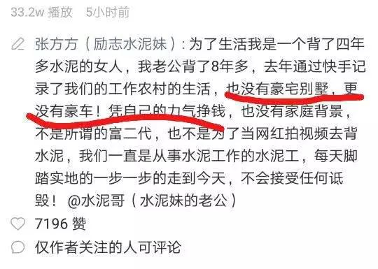 也沒有網上說的那些豪宅豪車,只是一個普通人而已。說她自己的工作就是搬水泥,已經背了四年多了,她的老公背了八年多了,只不過去年才通過快手發出來而已。