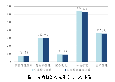 三季度專項執法檢查內容包括:預拌混凝土企業的質量管理體系、原材料管理、配合比設計、試驗管理、生產管理等方面,共計檢查預拌混凝土企業34家次,1478項次,其中合格1450項,合格率為98.1%,不合格項主要出現在試驗管理方面,具體情況見圖1。在執法檢查的同時對預拌混凝土試塊(拌合物)、原材料進行了抽檢,其中抽檢混凝土試塊(拌合物)115組,合格113組,合格率為98.3%,預拌混凝土出廠質量良好;抽檢原材料67組,全部合格。總體來看,我市預拌混凝土質量整體穩定可靠。