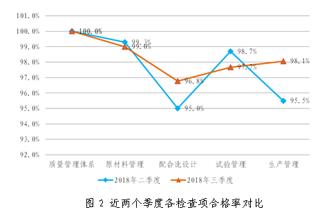 與二季度相比,原材料管理合格率下降0.3個百分點,配合比設計合格率提升1.8個百分點,試驗管理合格率下降1個百分點,生產管理合格率提升2.6個百分點,具體情況見圖2。