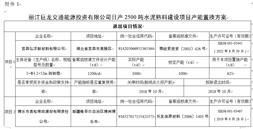 附件:1.麗江巨龍交通能源投資有限公司日產2500噸水泥熟料建設項目產能置換方案