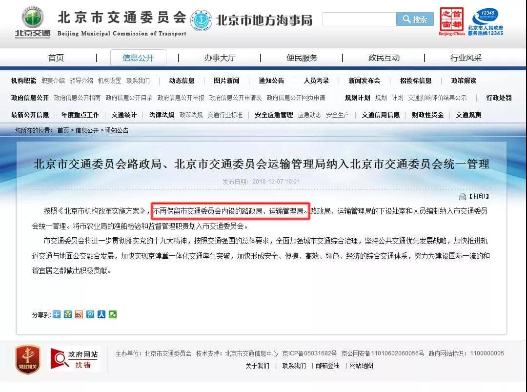 12月7日,據北京市交通委消息,按照《北京市機構改革實施方案》,不再保留市交通委員會內設的路政局、運輸管理局(簡稱路政、運管)。路政局、運輸管理局的下設處室和人員編制納入北京市交通委員會統一管理。