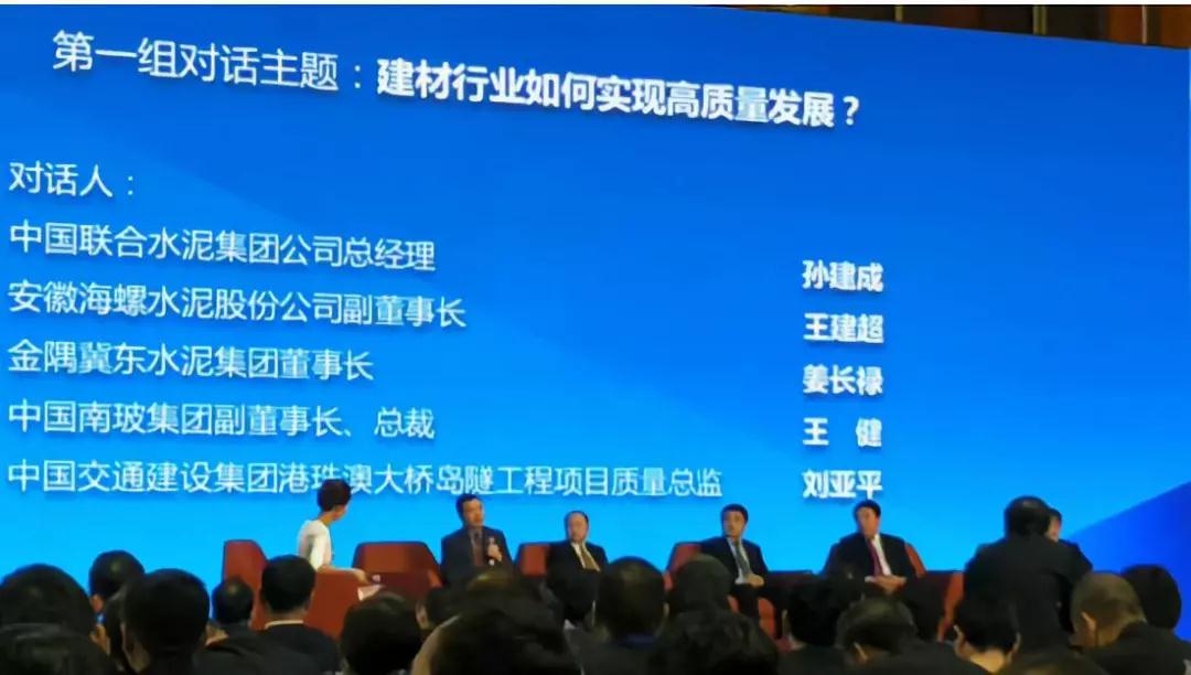 隨后,整個會議進行第一個議程,由中國聯合水泥集團公司總經理孫建成、安徽海螺水泥股份公司副董事長王建超、金隅冀東水泥集團董事長姜長祿、中國南玻集團副董事長、總裁王健、中國交通建設集團港珠澳大橋島隧工程項目質量總監劉亞平就“如何實現建材行業高質量發展”展開激烈的討論。